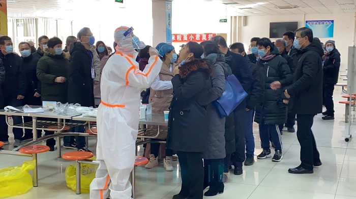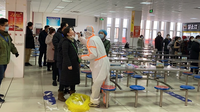 1月9日晚10:40,学校接到上级关于组织全省高等学校师生员工核酸检测的工作通知后,学校疫情防控领导小组连夜召开视频会议,安排部署相关工作。为保障此次核酸检测工作科学、高效、有序开展,党政办、后勤管理处按照疫情防控领导小组指示,以时不我待的紧迫感和责无旁贷的使命感,立即研究制定全校师生员工核酸检测方案。后勤管理处于当晚23:40紧急联络沧州市人民医院进行沟通磋商,最终确定第二天对我校全体师生进行核酸检测。党政办相关工作人员加班加点拟定我校全员核酸检测实施方案的同时,立即通知全校29个中层部门教职工核酸检测工作事宜,学生处和七学院负责通知全体学生在居住地全员核酸检测事宜。